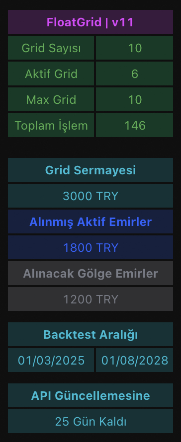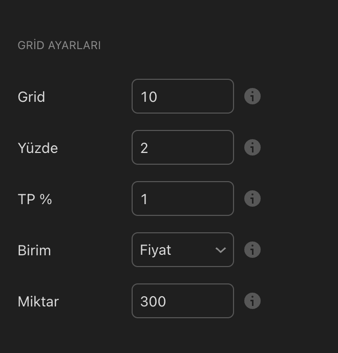 Her grid seviyesi arasındaki fiyat farkını yüzde olarak belirler. Fiyat bu oranda düştükçe yeni alım sinyali oluşturur.