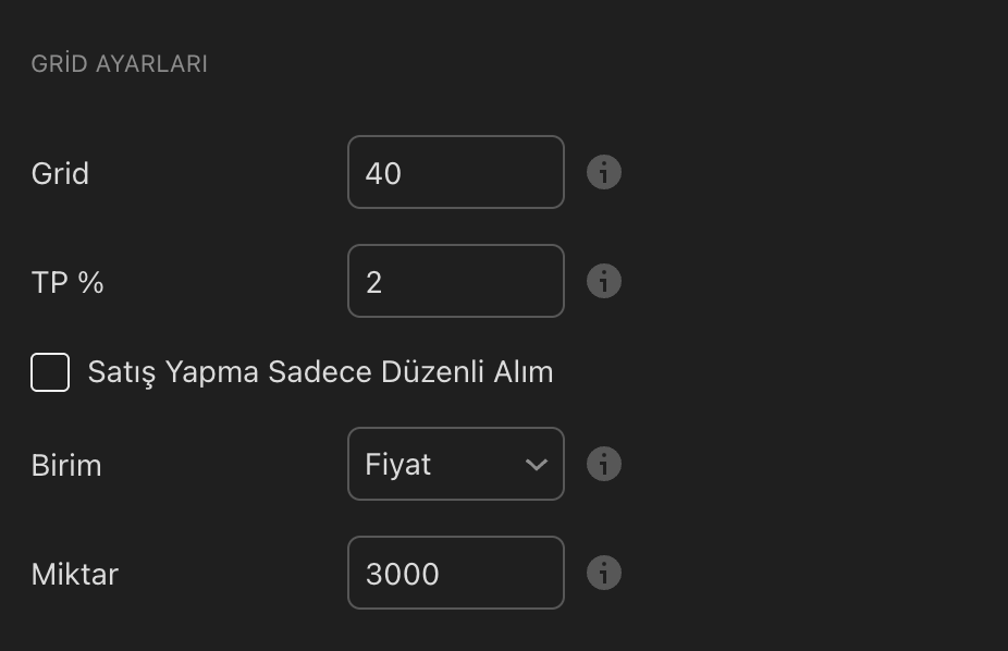 MiktarHer grid için kullanılacak alım-satım miktarını belirler. “Birim” parametresine göre Lot veya Fiyat cinsinden değerlendirilir.