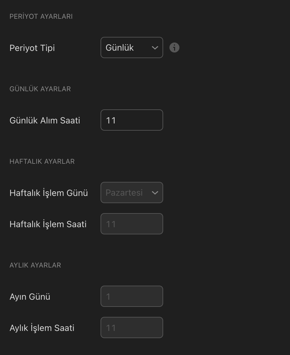 Haftalık İşlem SaatiPeriyot Tipi Haftalık ise alım yapılacak işlemin saatini belirler.